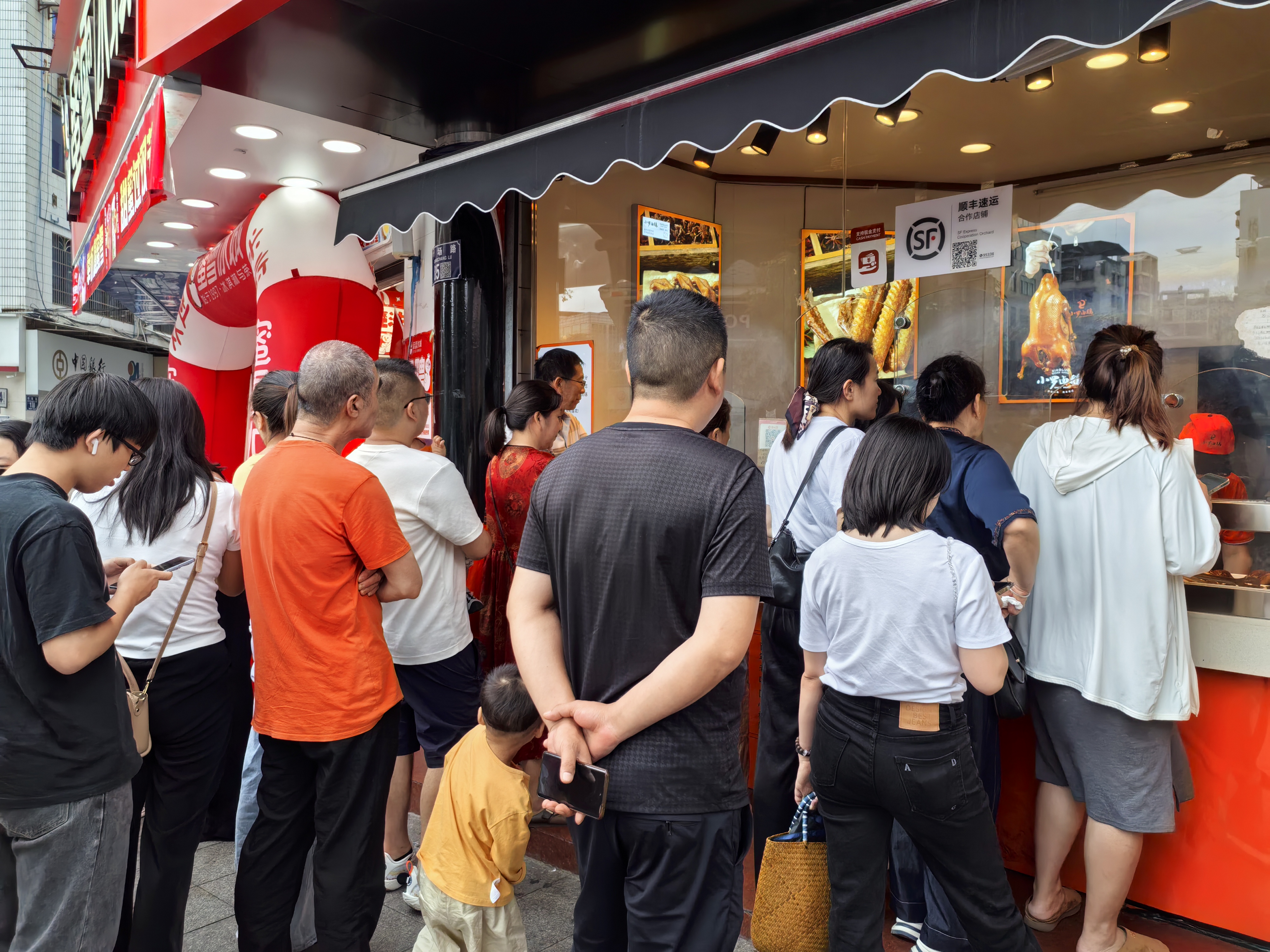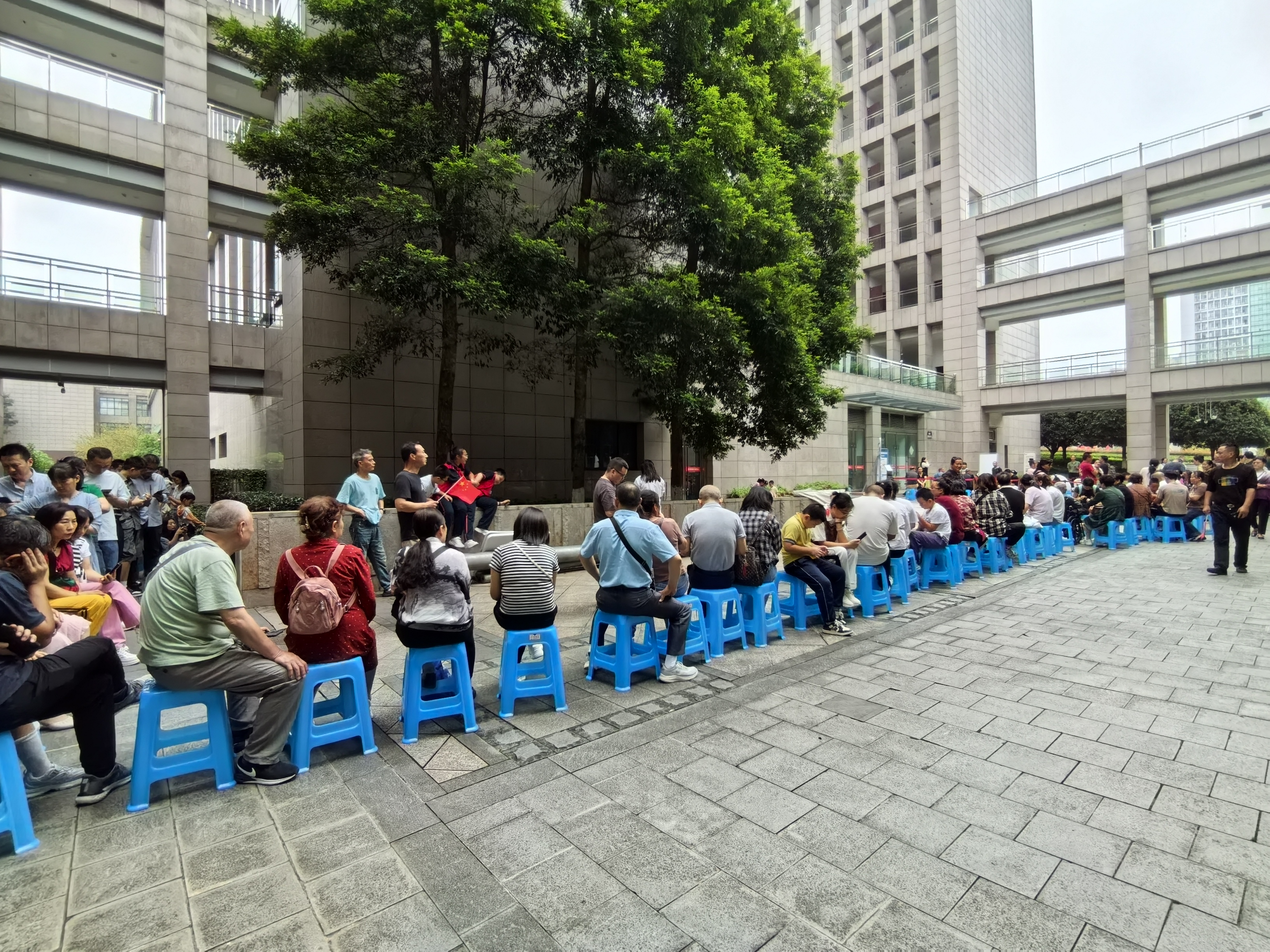 随后,记者朝着荣昌食堂方向走去,看到门口已排出了近百米的长队。食堂还贴心地在旁边摆放着凳子,供排队游客休息。