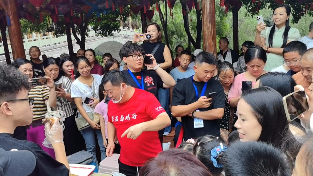 下午3点,记者来到位于夏布小镇的江哥特产馆。只见门店外已被游客围得里三层外三层,“卤鹅哥”林江正穿梭其中,组织吃卤鹅比赛。